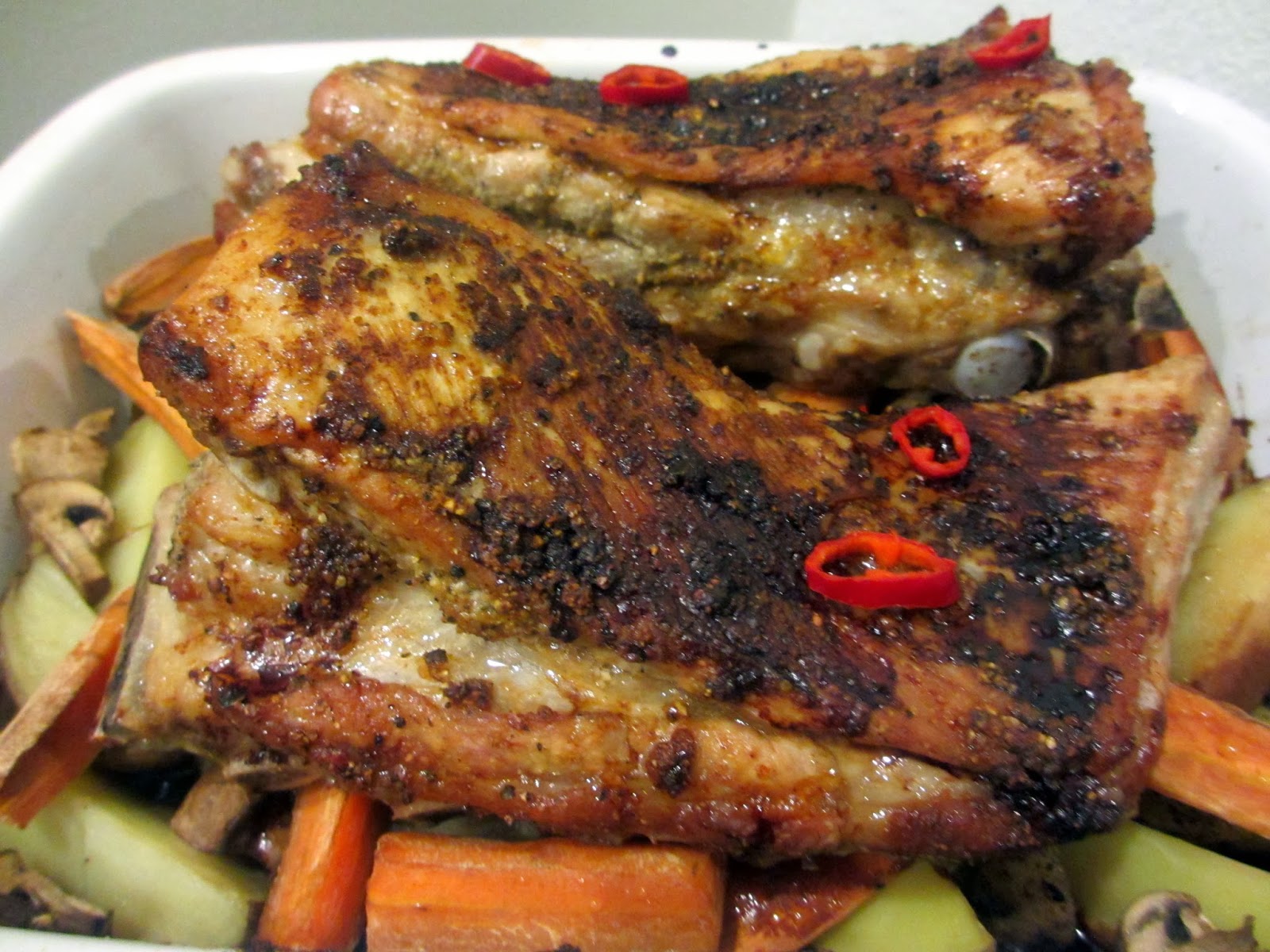 Küpseta 200 kraadi juures 1,5 tundi. 30 minutit enne lõppu määri ribidele sojakaste ning küpseta edasi.