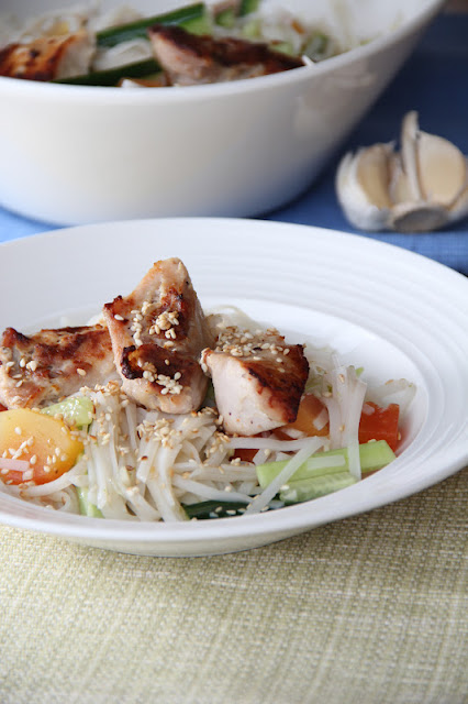 Jogurti- kanašašlõkk idamaise nuudlisalatiga