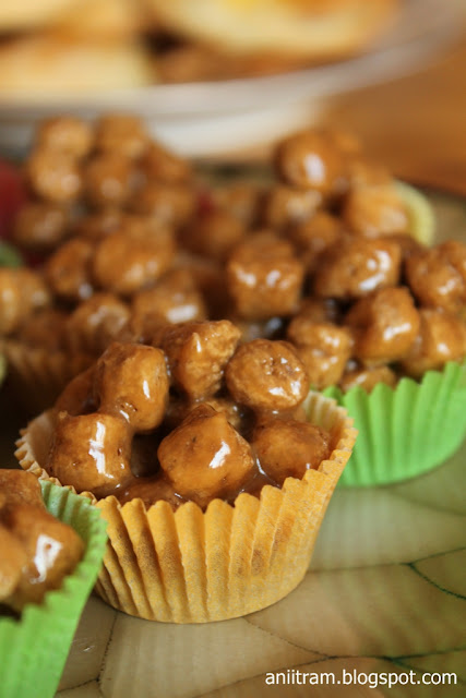 Sulatasin või ja sinna sisse ka iirisekommid. Kui mass oli sulanud ja ühtlane, segasin juurde kamapallikesed ja tõstsin lusika abil minimuffinivormidesse parajad portsukesed. Lasin täielikult jahtuda ja serveerisin.