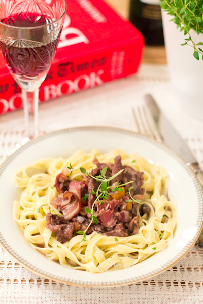 Algupärane retsept ei sisaldanud küll üldse ürte (bouquet garni), kuid leidsin, et päris ilma ikka ei saa ning lisasin tüümianioksi ning loorberilehe. Samuti ei meeldinud mulle kastme „õhuke“ konsistents ning lisasin lõpus kaks supilusikatäit jahust ja võist pastat (beurre manié), mis tegi kastme nuudlite külge kleepumise oluliselt hõlpsamaks.
