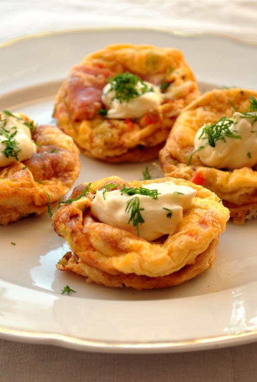 *Jahtunud omletid võtta vormist välja, igale omletile tõsta 1 tl toorjuustukreemi ning raputada peale hakitud tilli.