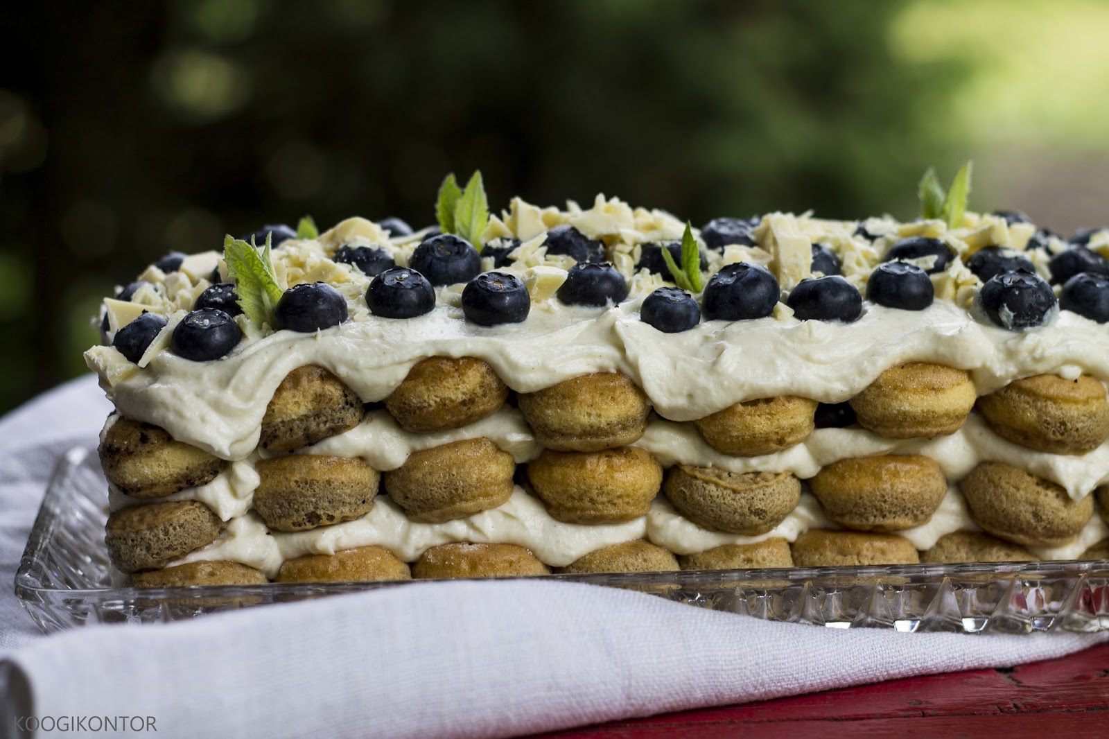 Kata küpsised 1/3 kreemiga ja aseta kreemile mustikad. Tee samamoodi kahe järgmise kihiga. Viimane kiht kaunista mustikate ja 50 g hakitud valge šokolaadiga.