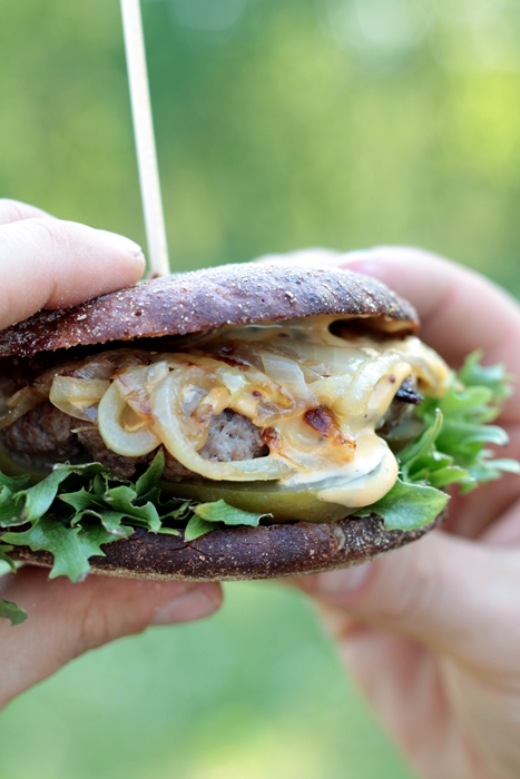 Rukkiburger veisepihvi ja karamellistatud sibulaga