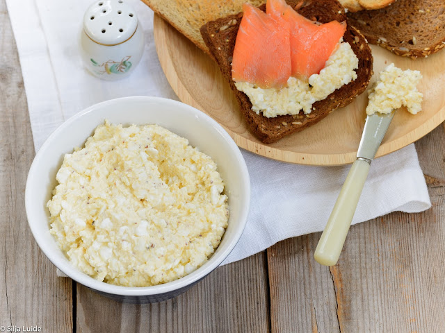 Ei suutnud kuidagi jätta sõna “taljesõbralik” postituse pealkirja lisamata, sest kõik munavõi retseptid, mida olen näinud, on sisaldanud 100-200 g võid 4-5 muna kohta. Kuna seda on minu jaoks pisut palju, siis olen ise alati lisanud munasegusse võid vaid 50 g ja üritanud konsitentsi ühtlaseks kreemiks saada hapukoort ja majoneesi kasutades. Et aga viimast asja leidub mu kodus üliharva, siis reeglina ajan läbi paksu hapukoore ja sinepi seguga. Seekord üritasin koostist veelgi tervislikumaks muuta lisades kodujuustu ja et tänasel eksprompt brunch’il juba retsepti küsiti, siis kasutan tekkinud vaba hetke, et tegemisõpetus ka blogisse lisada. Selleks, et pilti saada, pidin ma munavõid pärast hommikusööki uuesti tegema, sest hommikune sai kiirelt otsa :)