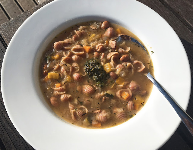 Supi panin kokku Itaalia minestronest ja Pranstuse soupe au pistou-st. Nende mõlema supi ühisnimetaja on värsked hooajalised juurviljad, oad, väikesed makaronid ja supile basiilikust tehtud pesto või pistou lisamine. Minestrone puhul läheb supi sisse serveerimisel pesto ja soupe au pistous pistou ehk ”prantsusepärane” pesto mis sisaldab kõiki samu koostisosi, mis pesto, välja arvatud juust ja küüslauk.